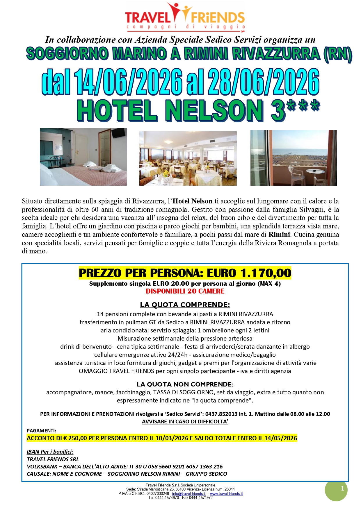 L'agenzia di viaggio Travel Friends, in collaborazione con l'Azienda Speciale Sedico Servizi, organizza due soggiorni marini a Rimini.